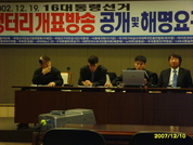 2008 12. 10 10:30 ~ 12:30 까지 프레스센터 19층 지자회견실에서 그간 전자개표기 부정선거 방지를 위하여 활동해온 이 재진 대표, 석 종대 대표 , 윤무길 박사, 최우근 교수등 과 10여개 시민 단체들 이 참석한 가운데 지난대선시 발생한 전자개표기 문제에 대한 문제의 제기와 금번대선에 대책등에 대한 발표가 있었다. 윤무길 교수는 프로그램 기술 분야 측면에서 이의 제기가 있었다. 윤박사는 개표의 부정여부를 떠나 전자개표기의 사용 자체가 문제라고 제기 했다. 그 이유로는 이 전자 개표기는 모든 장비가 사용을 위해서는 개발시 시험한 데이터와 양산시 시험한 데이터를 중심으로 장비의 정확도와 신뢰도를 입증한 아무런 근거도 없는 장비로서, 이러한 장비을 사용한 자체가 문제라는 것이다. 즉 부정을 한다해도 방지하고 확인할 방법이 없으므로 이러한 장비로 개표한 결과는 무효라는 것이다. 마지막 설명한 이재진 대표는 현재 법에 명시된 인원으로는 개표를 정상적으로 확인하기에는 턱없이 부족한 인원으로서 개표 장의 투명한 개표 보장에 대한 우려를 표명하였다.